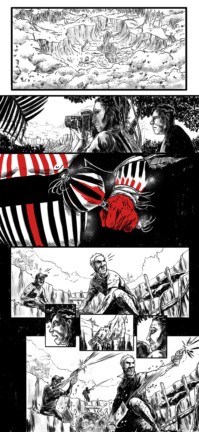 I was invited to create concept art, help develop the story visually, and draw and ink the comic book series. These are some of the first issue pages, thumbnails, concept art, and the poster I did for the release of Death Hunt at Comic Con Experience.